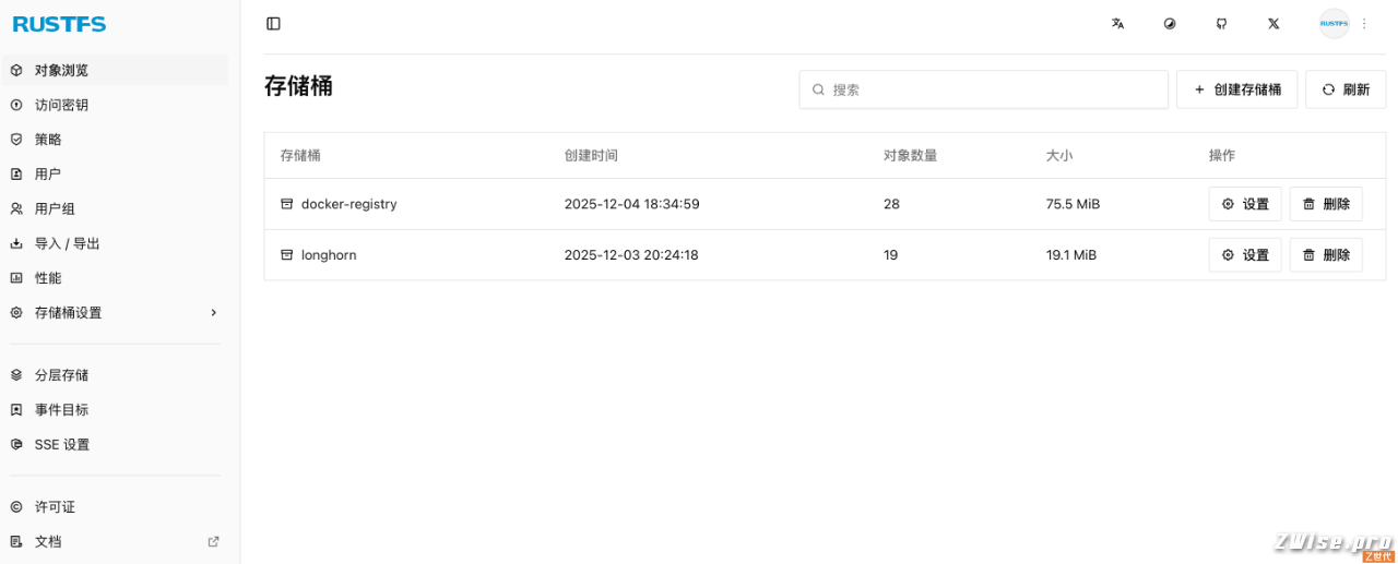 TIPS:RustFS 容器以 10001 运行,需要将挂载的宿主机目录的权限修改为 10001,否则会出现 permission denied 错误。